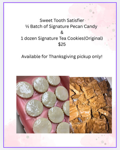 A half order of Signature Pecan Candy (approximately 20 pieces)(with pecans only) and a dozen of Signature Tea Cookies (white frosting only) to satisfy your Sweet tooth.